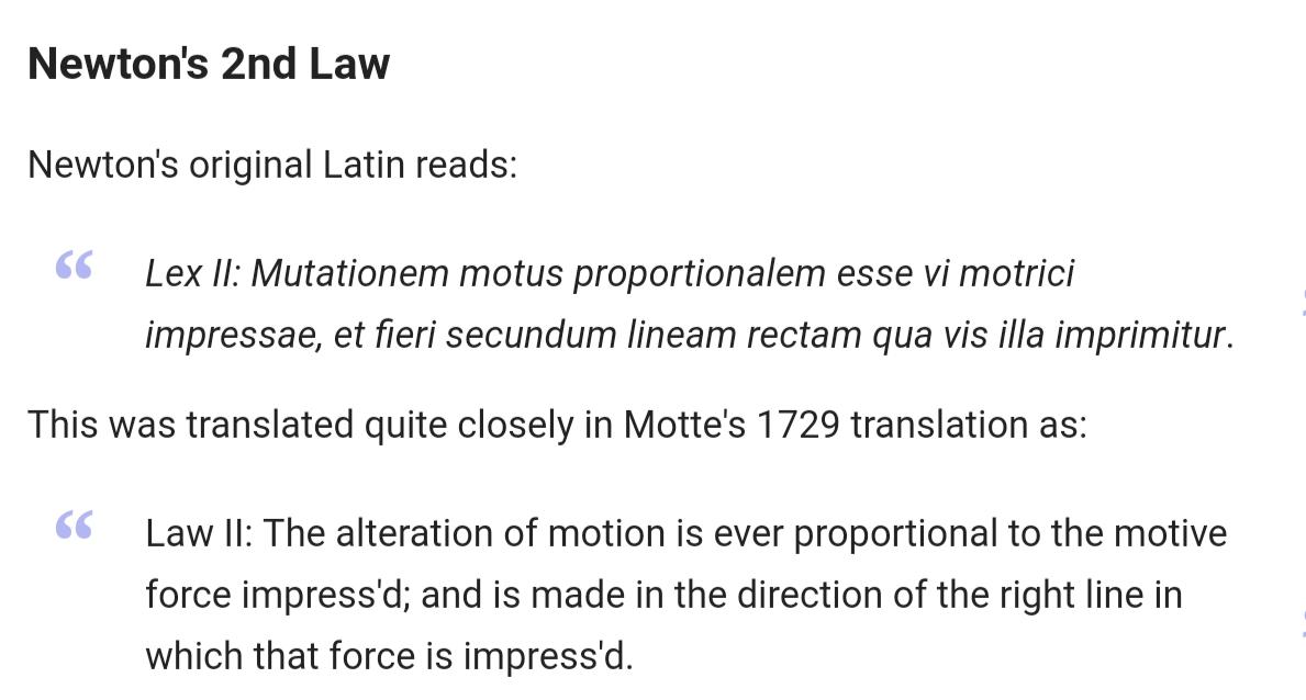 @e=mc2andallthat then chimed in with a really interesting point (in Latin). Newton’s second law was originally stated in his Principia as in this link. The interesting part is that it’s more like \(F=ma\) than I’ve suggested above. And he (@e=mc2andallthat, not Newton) goes on to point out that \(F=ma\) first appeared sometime before 1716.  It’s not easy to tell whether the ‘rate of change of momentum’ form was kicking around at that time, because it depends on how you translate phrases of Newton’s like “the alteration of motion”. Acceleration or change in momentum? I guess people spend whole careers on history and philosophy of science, working that kind of thing out. In any case, it would be really interesting to trace that development.